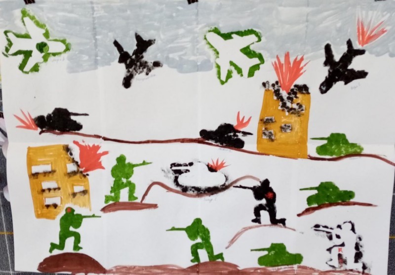 Коллективная работа воспитанников группы "Ягодки", посвящённая 80-летию Сталинградской битвы. Сталинград! Сталинград! Бой и ночью, и днем, Всюду дым, всюду гарь, Полыхает огнём Сорок третьего года январь. (В. Марахин)