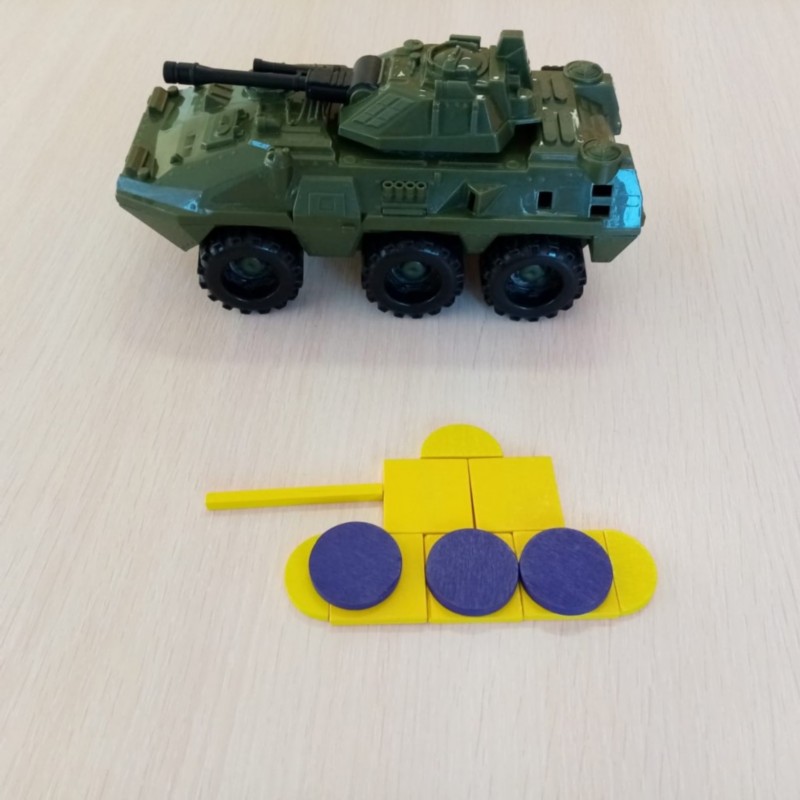 Дети создавали танк по образцу с использованием игрового набора "Дары Фрёбеля". «Дары Фрёбеля» – это мобильный методический комплекс, который позволяет корректировать ход игры под желания и возможности ребенка и служит основой познания и восприятия мира ребенка. Башня, гусеницы, пушка и мотор, как зверь ревёт. Это вовсе не игрушка, в цель снарядом точно бьёт.