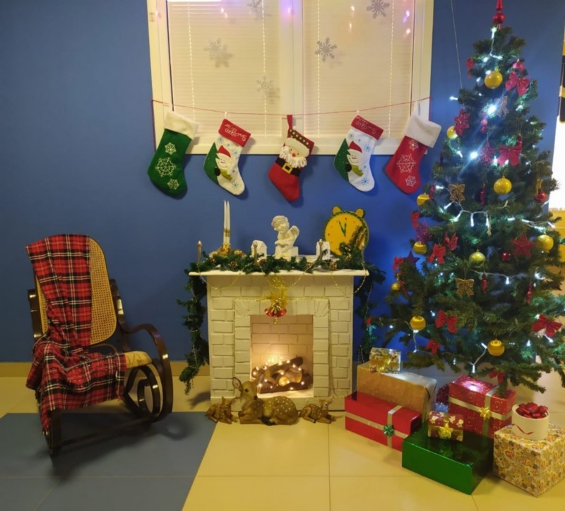 В фойе здания "Смайлики" сотрудниками детского сада оформлена волшебно красивая фотозона "Резиденция Деда Мороза".