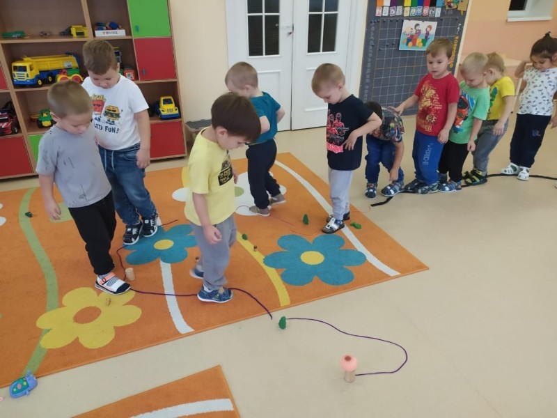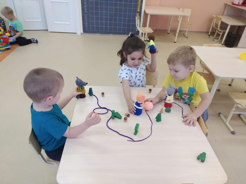 Дети создавали сюжетную композицию "дорожка в лесу" из гибких бытовых предметов и материалов - шнурков и ленточек. Полученные знания дети перенесли в самостоятельную деятельность, придумывали сказку.