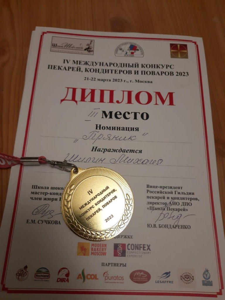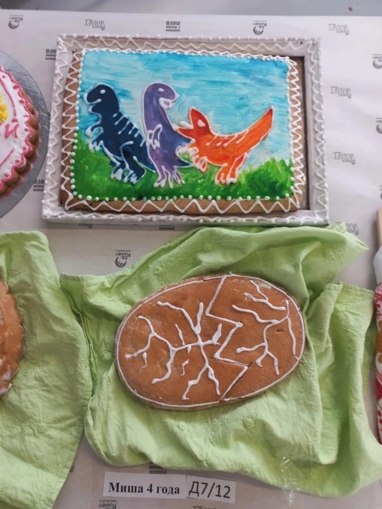 На суд жюри была представлена работа пряничная картина "Прогулки с динозаврами" и на дегустацию "Яйцо динозавра". Его работе присвоили бронзу! Миша, поздравляем тебя от всей души! Так держать!